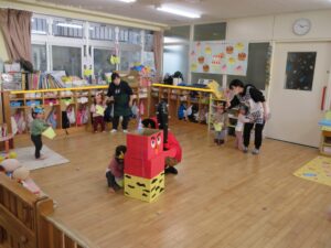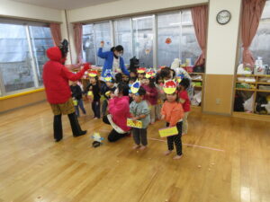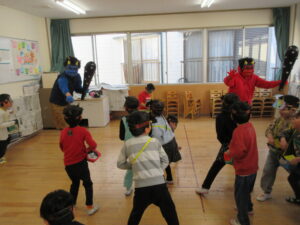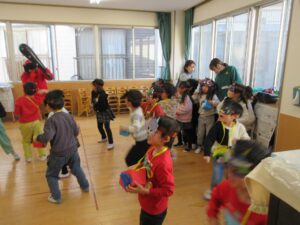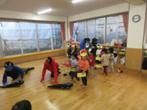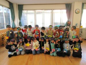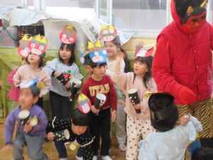 学校法人富士学園 認定こども園 > 最新情報 > 園ブログ > 😊豆まき👹😊豆まき👹2026年2月9日2026年2月9日園ブログ3日(火)節分の日に園でも豆まきをしました。 各クラス鬼のお面や豆入れをそれぞれに製作してかわいい物が出来上がりました♡ 🍒さくらんぼ組 🍓いちご組 🍋れもん組 🍎りんご組 🍑もも組 🍊みかん組 鬼さんが各部屋にやってきました❕ ~おにはそと~ふくはうち~ 👐やっつけた~👐 みんなの心の中にいる、怒りんぼ鬼・泣き虫鬼・イヤイヤ鬼などいろんな鬼を豆をまいて追い払い、優しい福の神を心の中に取り入れることができました😊一年間元気に過ごせますように✨✨