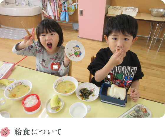 当園では『食べること』にも力を入れており栄養士による栄養管理(直接雇用による自園調理)はもちろん、安全で安心できる食材を使用し旬の食材や季節を感じられる献立づくりに努め美味しい食事・おやつを提供いたします。
