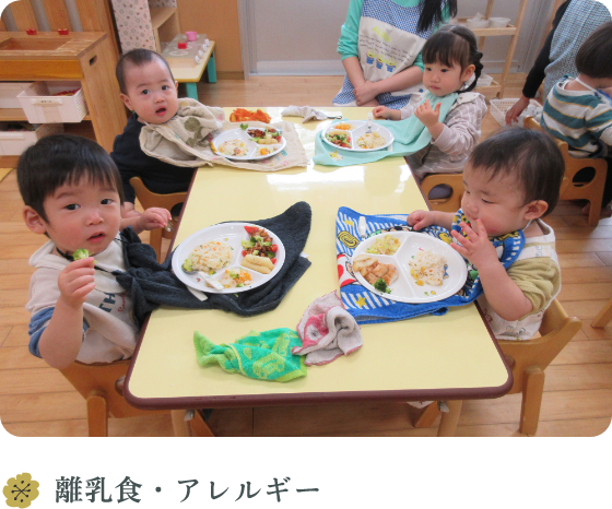 離乳食は一人ひとりの様子を見ながら、すりおろしたり、さいの目に刻んだり、もって食べやすいスティック状にしたりして、お子さまの発育状況を確認しながら進めていきます。食物アレルギーへの対応は、保護者の方と個別面談の上確認しながら進めていきます。医師の指示のもと、完全除去食対応いたしますので、医師の診断書(指示書)のご提示をお願いいたします。