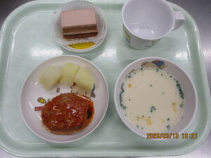 学校法人富士学園 認定こども園 > 最新情報 > 給 食 > ❄3月13日の給食❄❄3月13日の給食❄2026年3月13日給 食こんにちは🌞 今日の給食は 煮込みハンバーグ,粉ふきいも,コーンクリームスープ,お祝いケーキでした🍰✨ おやつはラスクでした♪ 明日は卒園式ですね🌸 卒園児の皆さまおめでとうございます🌷✨