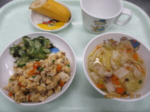 学校法人富士学園 認定こども園 > 最新情報 > 給 食 > ❀4月14日の給食❀❀4月14日の給食❀2026年4月14日2026年4月14日給 食こんにちは🌞 今日の給食は いり豆腐,きゅうりとわかめの酢の物,白菜としめじのすまし汁,バナナ🍌でした❣❣❣ 明日もお楽しみに~♪♪♪