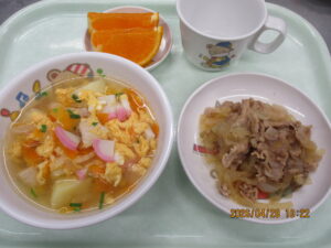 学校法人富士学園 認定こども園 > 最新情報 > 給 食 > ❀4月28日の給食❀❀4月28日の給食❀2026年4月28日2026年4月28日給 食こんにちは🌞 今日の給食は 具だくさんのかきたま汁,豚肉のしょうが焼き,みかん🍊でした❣❣❣ もうすぐゴールデンウィークですね♪ 皆さんはどこかお出かけをするのでしょうか?? ちなみに私はどこにも行きません!(^^)! 大掃除をしてドラゴンクエストⅢを完クリします❣❣❣