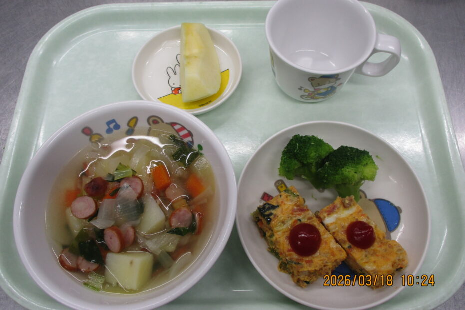 こんにちは🌞 今日の給食は ポトフ,チーズオムレツ,ブロッコリーの塩ゆで,りんご… 続きを読む »🌸3月18日の給食🌸